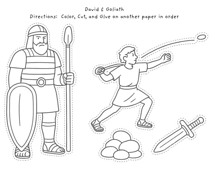 • ✂️ Cut, Color & Paste Craft: Children assemble their own David and Goliath scene — complete with David, Goliath, sling, stones, and sword — perfect for storytelling and display