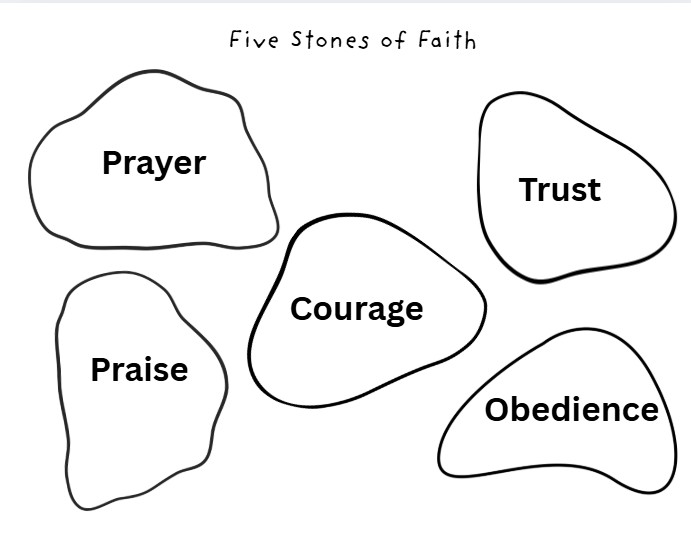 • 🪙 “Five Stones of Faith” Activity: Create five paper stones labeled Courage, Prayer, Trust, Obedience, and Praise — a powerful take-home reminder
