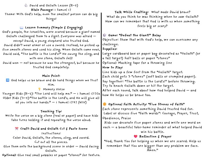 • 📖 Bible Lesson Summary: Simplified retelling of 1 Samuel 17 for all grade levels