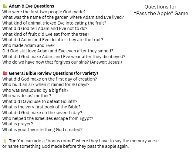 🍎 Bonus Activity: “Pass the Apple” game with kid-friendly Bible questions