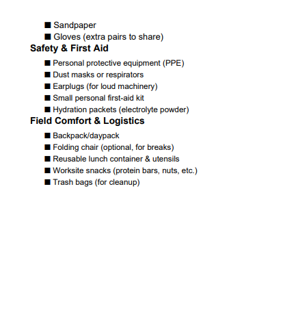 2. Packing Checklist (personal, tools, safety, supplies)