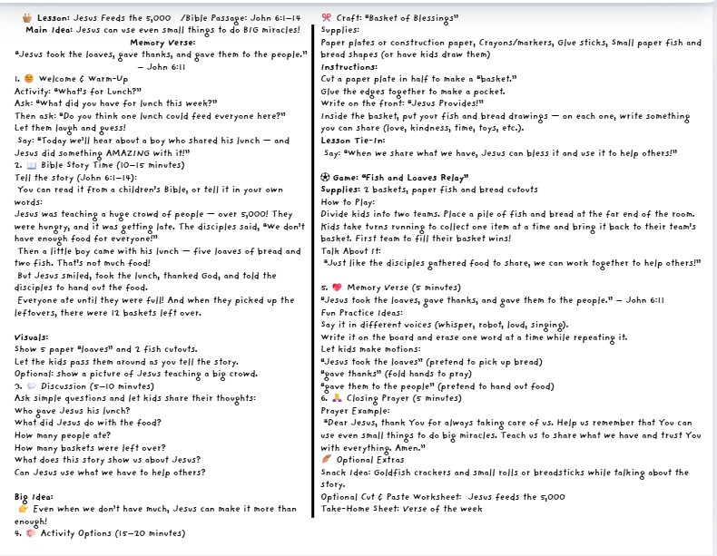 Designed for Kindergarten through 5th Grade, this lesson includes fun, hands-on activities, discussion questions, crafts, and games that bring the story of John 6:1–14 to life. Perfect for Sunday School, Children’s Church, or Christian classrooms!