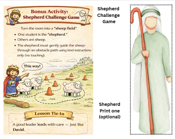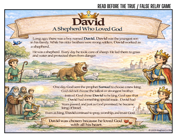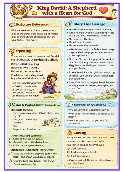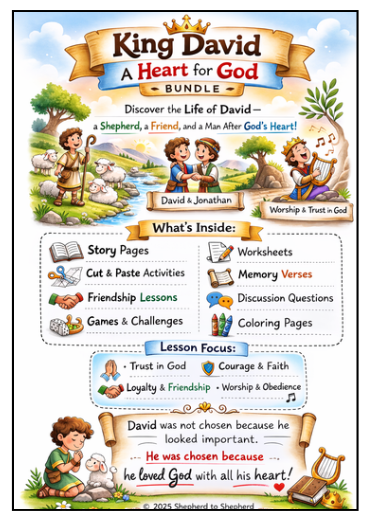 This engaging, kid-friendly Bible lesson bundle explores the life of King David — not just as a king, but as a shepherd, a loyal friend, and a worshiper of God.