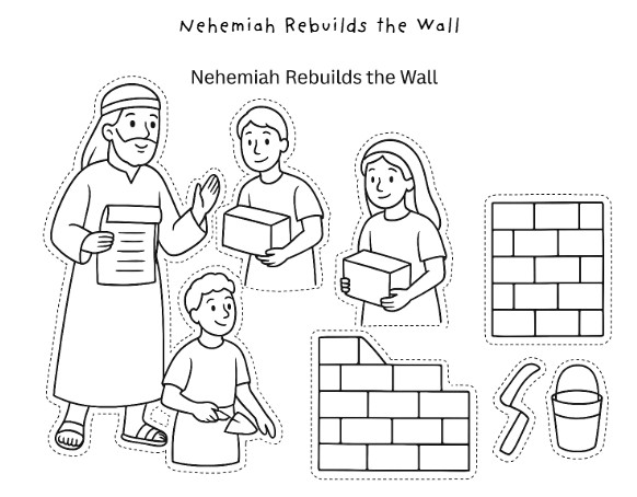 ✂️ Cut & Paste Scene Builder: Kids color, cut out, and glue the wall-building figures and background to recreate the story.