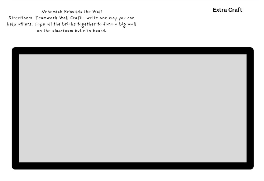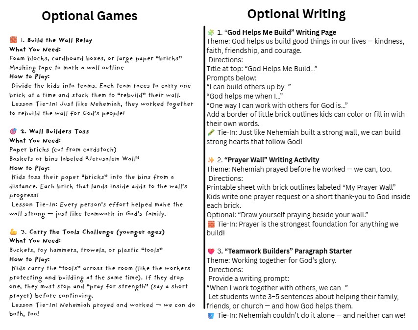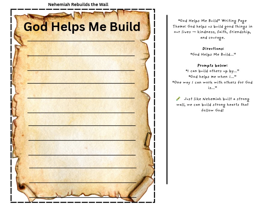 ✏️ Writing Activity: “If I were Nehemiah…” reflection page that encourages children to write how they can help build or serve in their own lives.