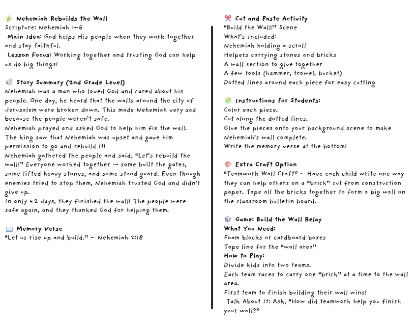 Bring the powerful story of Nehemiah’s courage and teamwork to life with this engaging Bible lesson set! Perfect for Sunday school, homeschool, or children’s ministry, this printable pack helps kids understand what it means to work together for God’s purpose.