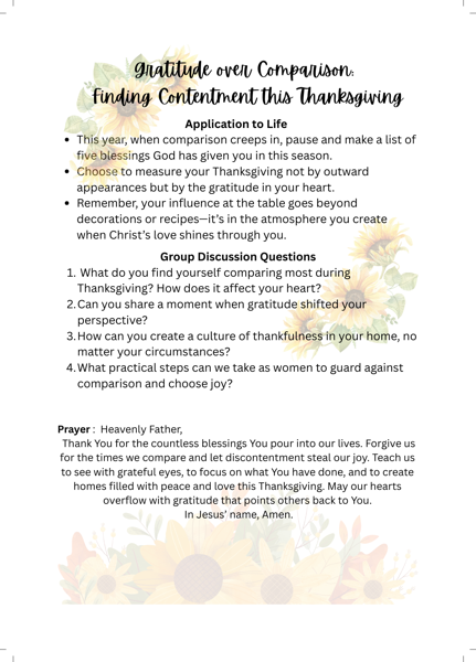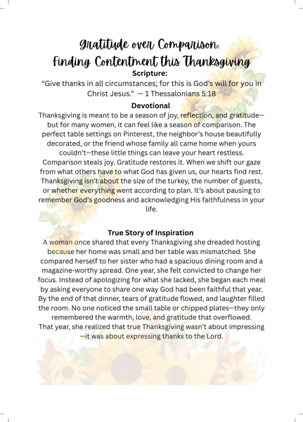 Discover a heartfelt devotional designed especially for women during the Thanksgiving season. Gratitude over Comparison: Finding Contentment this Thanksgiving invites women to pause, reflect, and embrace true thankfulness even in the middle of life’s pressures and holiday expectations.