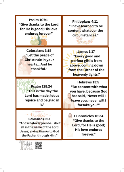 8 Take-Home Scripture Cards featuring key verses about gratitude and contentment.