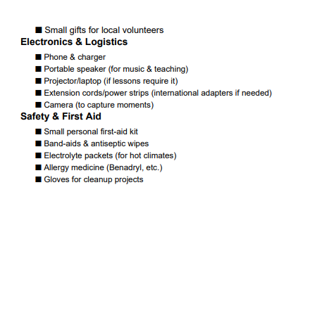 2. Packing Checklist (personal, clothing, teaching supplies, games, snacks, safety)